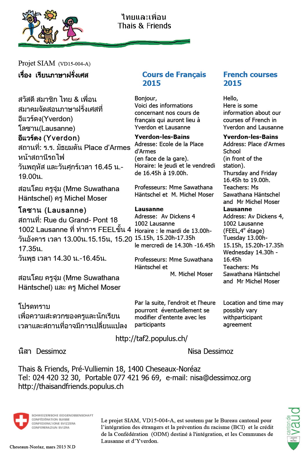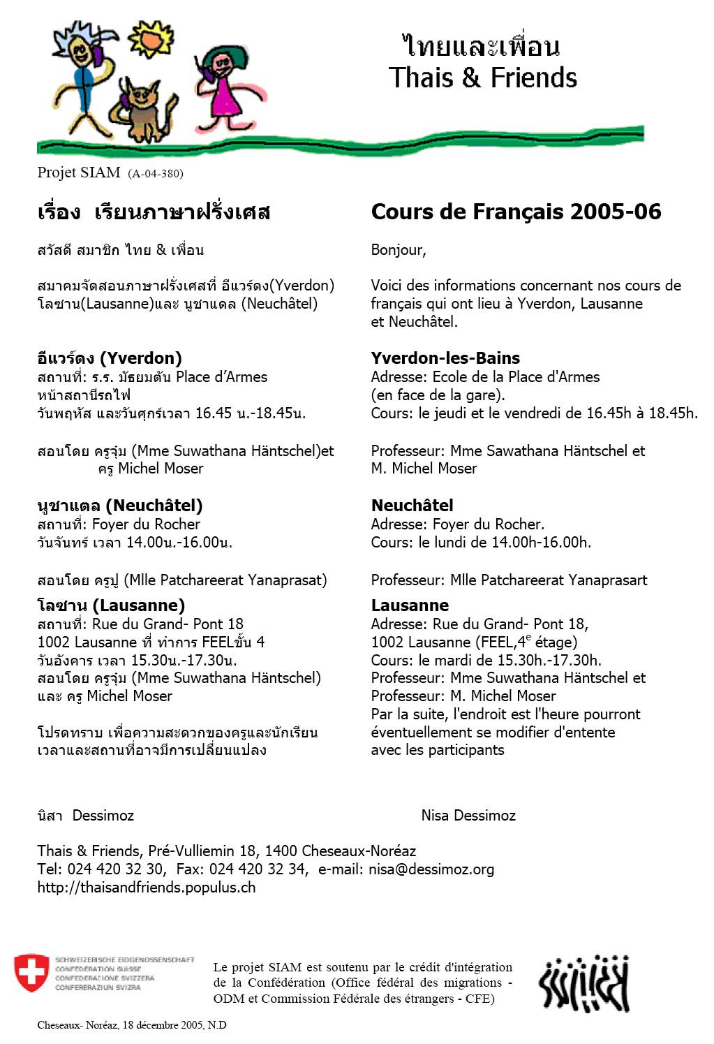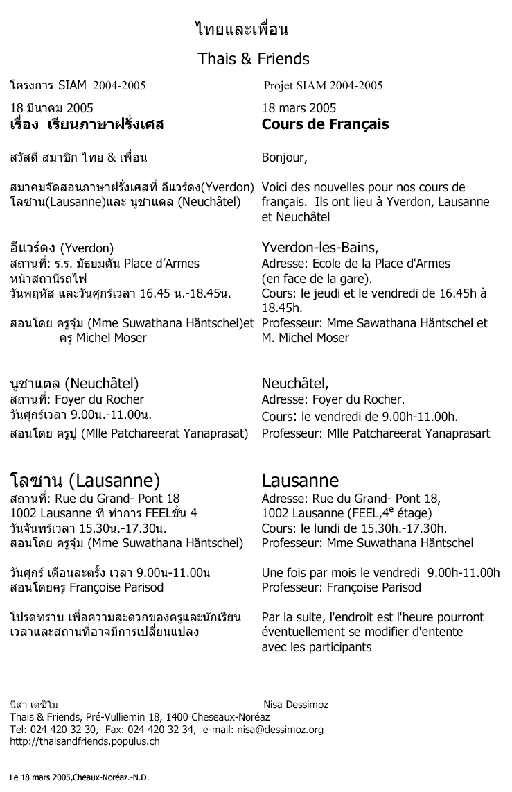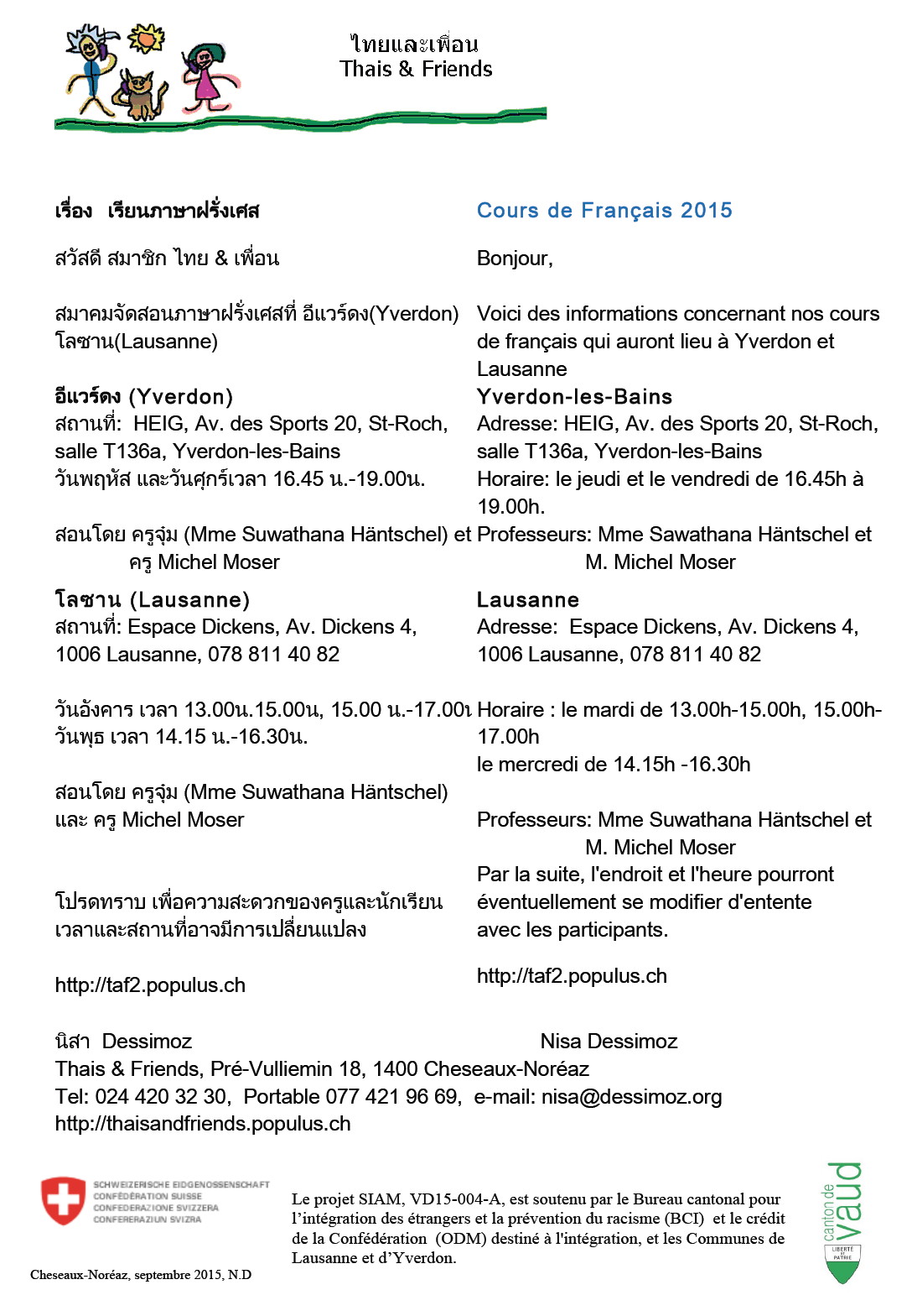 Les cours se renouvellent régulièrement depuis 2003, et sont assurés au moins jusqu'à fin 2017. Pour les derniers détails (niveaux courants, horaires et lieux), prière de contacter la responsable du programme ou directement les professeur(e)s indiqués.