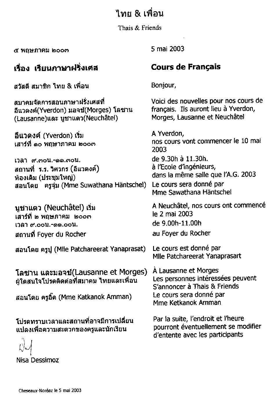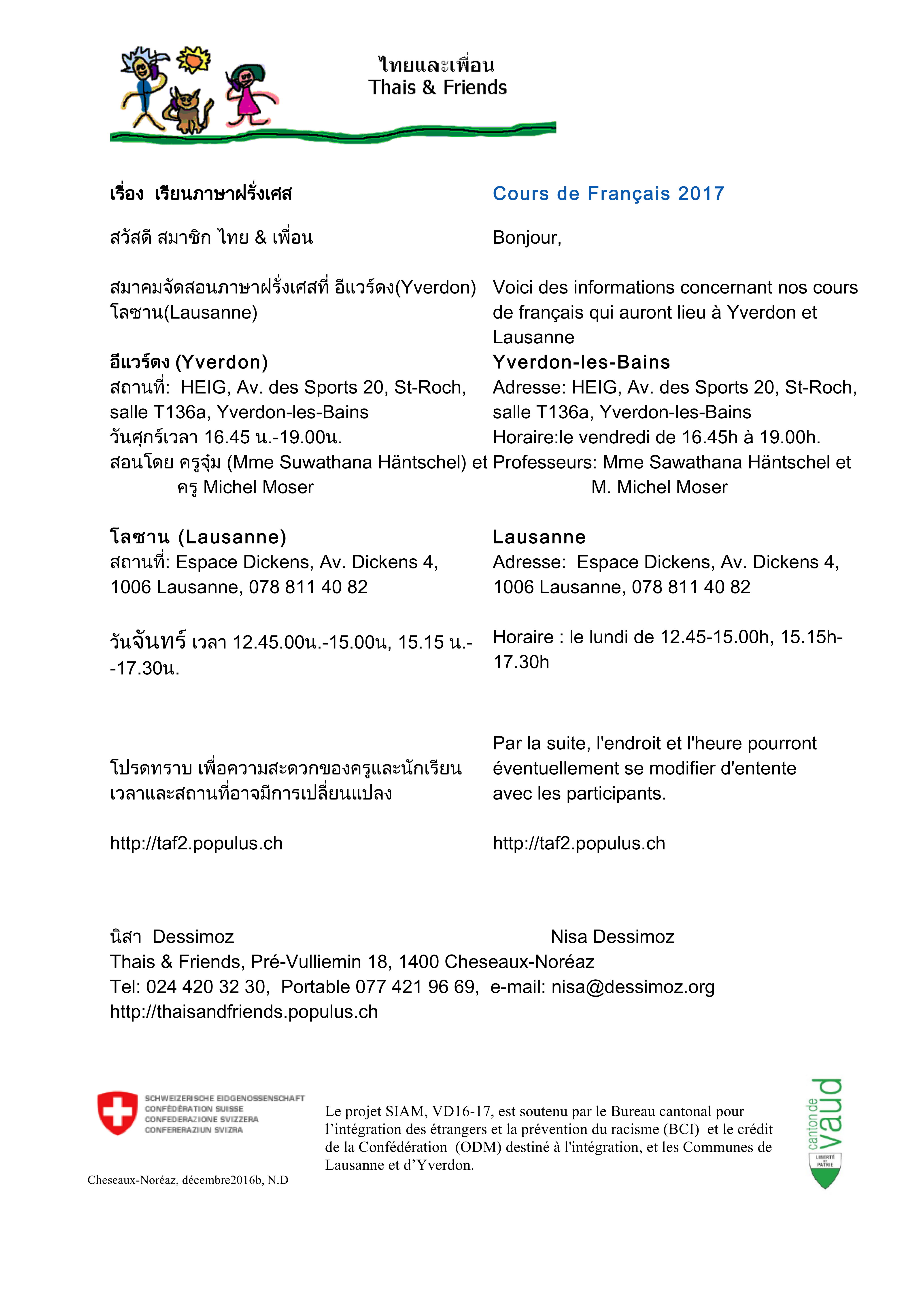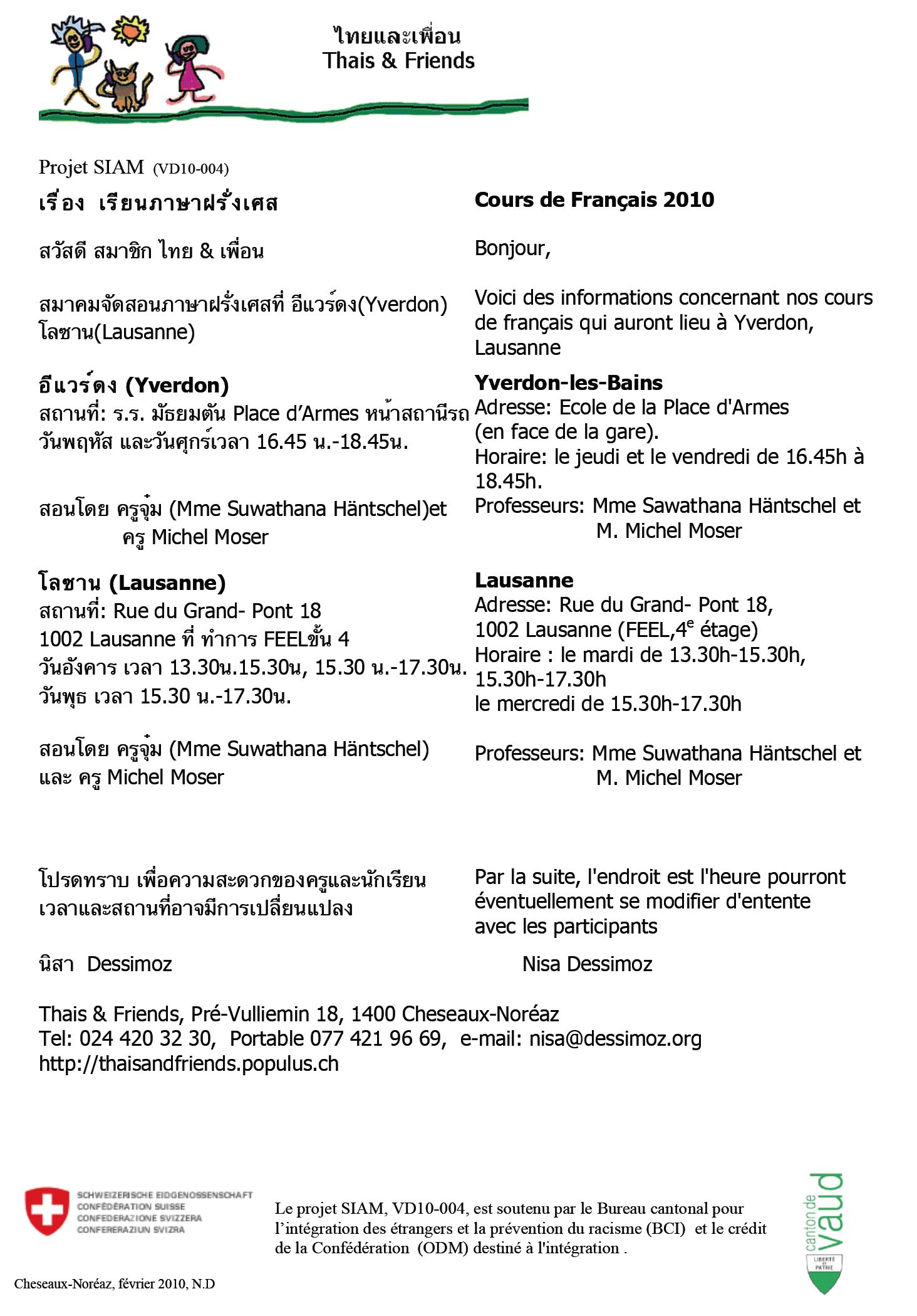 Les cours se renouvellent régulièrement depuis 2003, et sont assurés au moins jusqu'à fin 2017. Pour les derniers détails (niveaux courants, horaires et lieux), prière de contacter la responsable du programme ou directement les professeur(e)s indiqués.